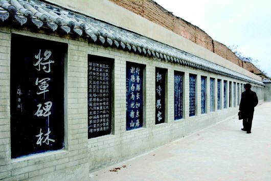 中岔古堡一堡三院,分為前院、中院、后院。走進(jìn)古堡,堡門左側(cè)建有戲樓,上書“中岔劇場(chǎng)”四字。戲樓(又稱戲臺(tái))始建于清光緒年間,上世紀(jì)六七十年代曾重修過。近堡門處右側(cè)堡墻下修建有兩處一體化的石碑長(zhǎng)廊一直通向后院,碑廊中石碑一塊接著一塊砌筑在青磚墻內(nèi),石碑與石碑之間以青磚分隔,上覆筒瓦和滴水防護(hù),每一通石碑上都刻有中華人民共和國將軍書寫的一幅書法作品。第一通石碑上甘谷籍將軍張臣剛書寫的“將軍碑林”四字分外醒目,劉精松、邢世忠、裴懷亮、李乾元等數(shù)十位叱咤風(fēng)云的共和國將軍書寫的書法碑刻依次嵌進(jìn)墻內(nèi),組成一個(gè)氣勢(shì)磅礴、雄偉壯觀的將軍書法長(zhǎng)廊,這就是新建的將軍碑林。