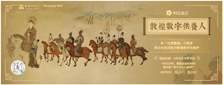 除了創(chuàng)意互動(dòng)帶來(lái)的新奇體驗(yàn),敦煌研究院與騰訊在“99公益日”還將發(fā)布文博行業(yè)首個(gè)公益NFT(Non-Fungible Token,非同質(zhì)化通證)藏品。9月9日9時(shí)開(kāi)始,用戶在“云游敦煌”小程序參與文化答題即有機(jī)會(huì)獲得這款限量數(shù)字藏品。這份NFT藏品生動(dòng)呈現(xiàn)了《張議潮統(tǒng)軍出行圖》與《宋國(guó)河內(nèi)郡夫人宋氏出行圖》壁畫的細(xì)節(jié),并首次讓用戶在線上觀看到敦煌莫高窟第156窟的全景。