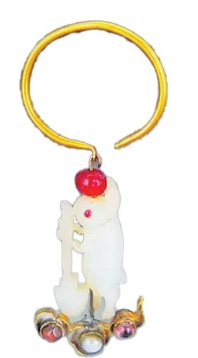 北京市昌平區(qū)十三陵定陵地宮明代定陵孝靖皇后的棺內(nèi),有一對(duì)金環(huán)鑲寶石玉兔耳墜。該金環(huán)鑲寶石玉兔耳墜中,兔子直立,雙耳上豎,玉色青白細(xì)潤(rùn),以紅寶石嵌飾雙眼,兩前爪抱杵作搗藥狀,下有臼,兔身上以細(xì)密陰線刻出毛發(fā)。