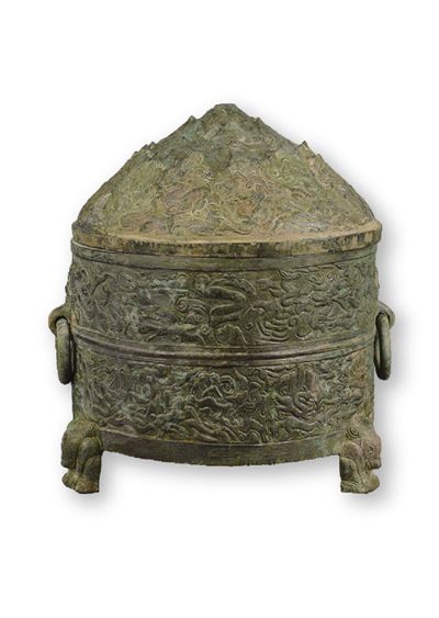 樽為古代盛酒的器具。李白《行路難》云:“金樽清酒斗十千,玉盤(pán)珍羞直萬(wàn)錢(qián)。”考古發(fā)現(xiàn)的酒樽最早出現(xiàn)在戰(zhàn)國(guó)時(shí)期,漢代酒樽常與杓、承盤(pán)等酒具配套使用。此件銅樽裝飾紋飾繁縟華麗,制作工藝精湛細(xì)膩,是東漢青銅冶煉技術(shù)的杰出代表。