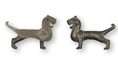 銅虎符(圖③)高4.7厘米、長(zhǎng)6.9厘米?;A豎耳,怒目張口,挺胸昂首,尾上翹,作奔走狀。符頭部有圓穿孔,背面有凸起的十字扣。符身正面陰刻篆書(shū)“永安府”字樣,背面陰刻楷書(shū)“右翊衛(wèi)”“右驍衛(wèi)”“永安四”“蘭豐二”等字樣。右翊衛(wèi)、右驍衛(wèi),官署名,為隋唐十六衛(wèi)中的兩衛(wèi)。隋初稱(chēng)左右衛(wèi),隋煬帝時(shí)改為左右翊衛(wèi),所領(lǐng)軍士稱(chēng)驍騎。館藏虎符出土于甘肅莊浪,是隋代府兵駐防莊浪的歷史見(jiàn)證,是研究隋代府兵制度的重要實(shí)物資料。