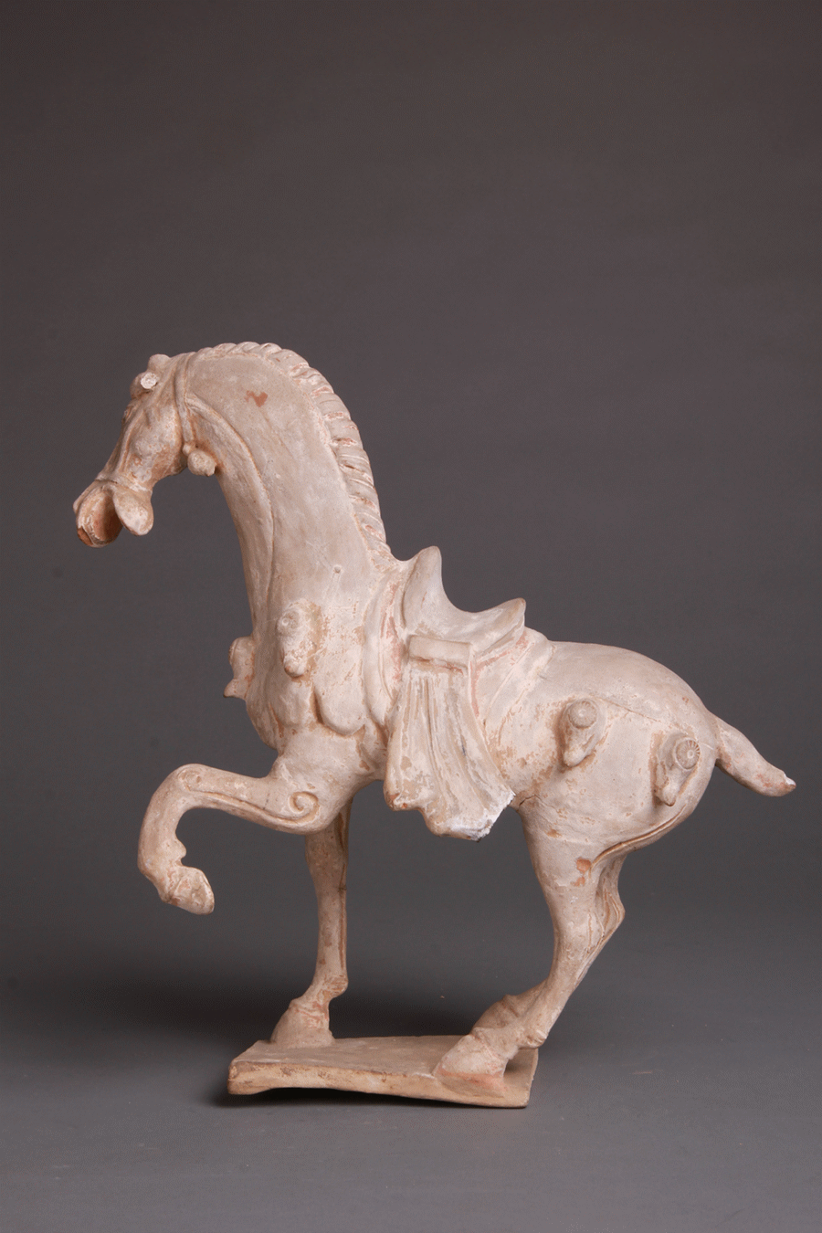 甘肅省天水市博物館收藏的這件瑰寶——唐代陶舞馬,三足立于平板之上,左前蹄屈曲,搖頭擺尾,張口嘶鳴,做舞蹈之狀。其姿勢(shì)優(yōu)雅、神態(tài)鮮活。
