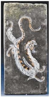 這件高臺縣博物館館藏的漢晉彩繪虎畫像磚,長42.5厘米,寬20厘米,厚6.5厘米,出土于駱駝城苦水口1號墓葬,屬國家二級文物。作為“四神”形象之一,多見于墓葬中磚砌門飾構(gòu)件之上。