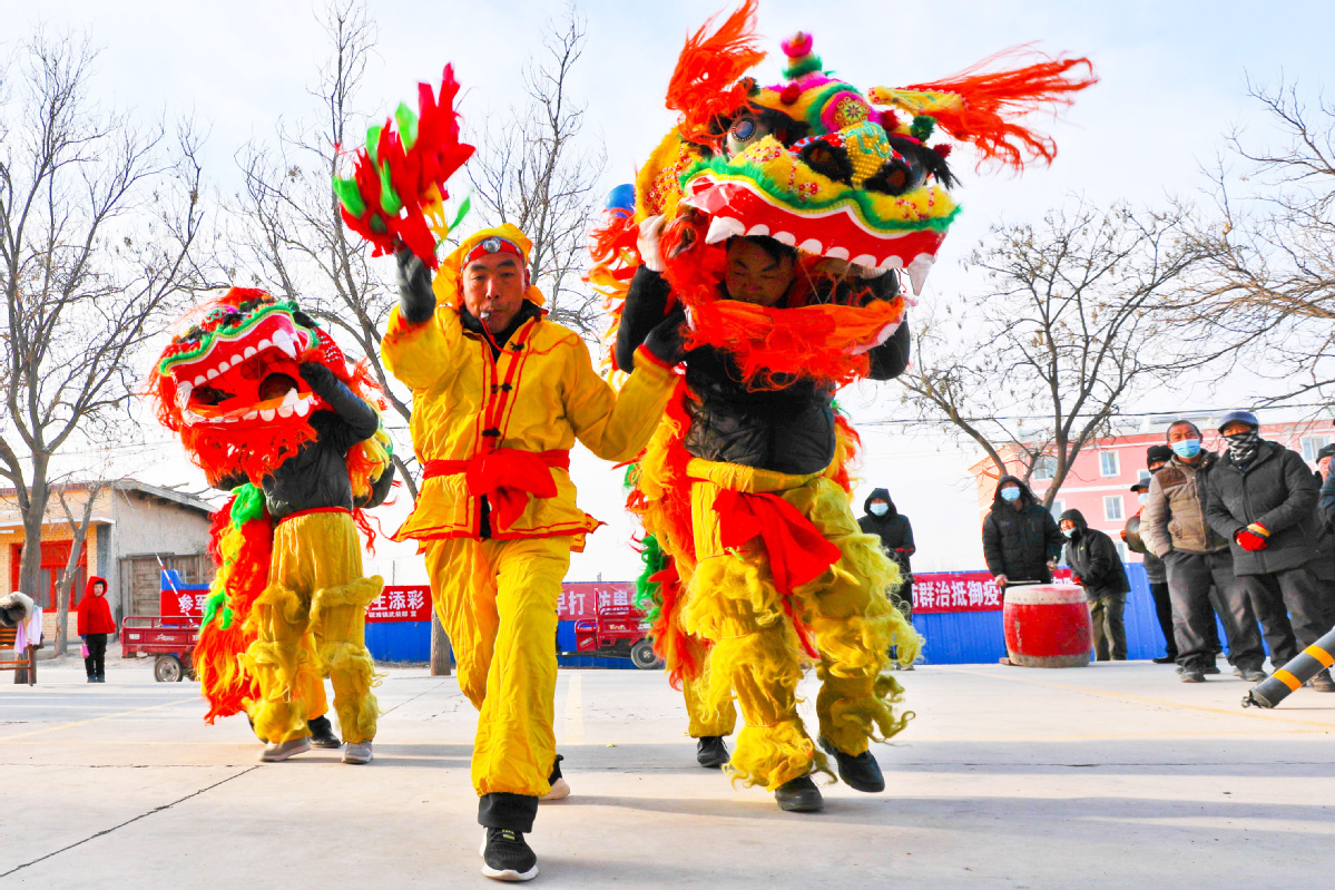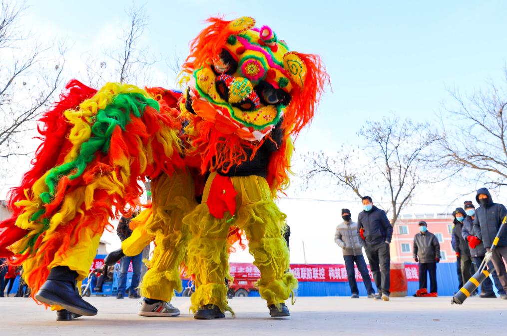 1月26日,甘肅省張掖市甘州區(qū)堿灘鎮(zhèn)草湖村文化廣場上,村文化隊(duì)為鄉(xiāng)親們表演了獅頭擺,追繡球,飆起來,威掃天下知的獅舞,迎接即將到來的新春佳節(jié)。