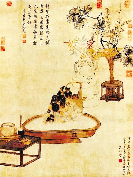 類(lèi)似的畫(huà)作還有明代吳門(mén)畫(huà)派張宏的作品。畫(huà)面中心的榾柮爐中溫著一壺酒。后側(cè)果盤(pán)中盛放佛手,插花的器物則是枯瘦的青銅花觚和清麗的白瓷瓶,所插之物相應(yīng)地配以墨線勾勒的梅柏和淡雅設(shè)色的天竹。