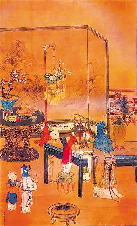 熟稔了這些歲朝清供的組合意象,就可以在單獨(dú)描摹景物之外,將其應(yīng)用到各種其他年節(jié)繪畫(huà)中了。清宮流行的嬰戲圖里,歲朝清供就作為背景或具體的物件,融入畫(huà)中。