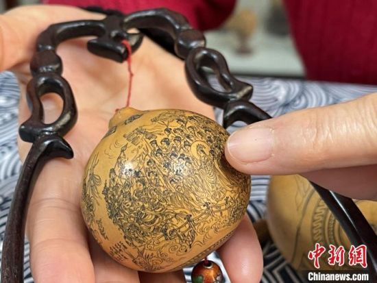 圖為長(zhǎng)約二十公分的長(zhǎng)條葫蘆雕刻佛教經(jīng)文作品。 張婧 攝