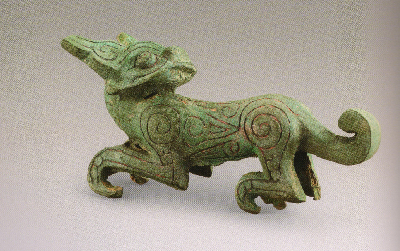 禮縣大堡子山祭祀樂(lè)器坑出土,共三只,造型相同,大小相似,為全國(guó)虎伴樂(lè)器出土的首例。其形象回首卷尾、聳耳曲爪、憨態(tài)可掬,極具觀賞性,是春秋時(shí)期虎造型的杰作,體現(xiàn)了秦國(guó)早期高超的造型能力和精湛的鑄造技術(shù)?;⒌男蜗笤诖呵锴厝说钠魑镏卸嘁?jiàn),不但有自成個(gè)體的金虎、青銅回首虎,同時(shí)虎作為附飾也出現(xiàn)在一些大的青銅器上。