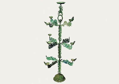 燈座為倒置喇叭形,座面飾瑞獸紋和云氣紋。燈呈樹(shù)形,主干分為三段,套插而成,段與段銜接處各置十字形托架,猶如燈樹(shù)之分枝。十字托橫向四出,四端各飾透雕花葉一個(gè),象征火焰,干枝頂端有仙人騎鹿形花飾。原有燈13盞,現(xiàn)存9盞。
