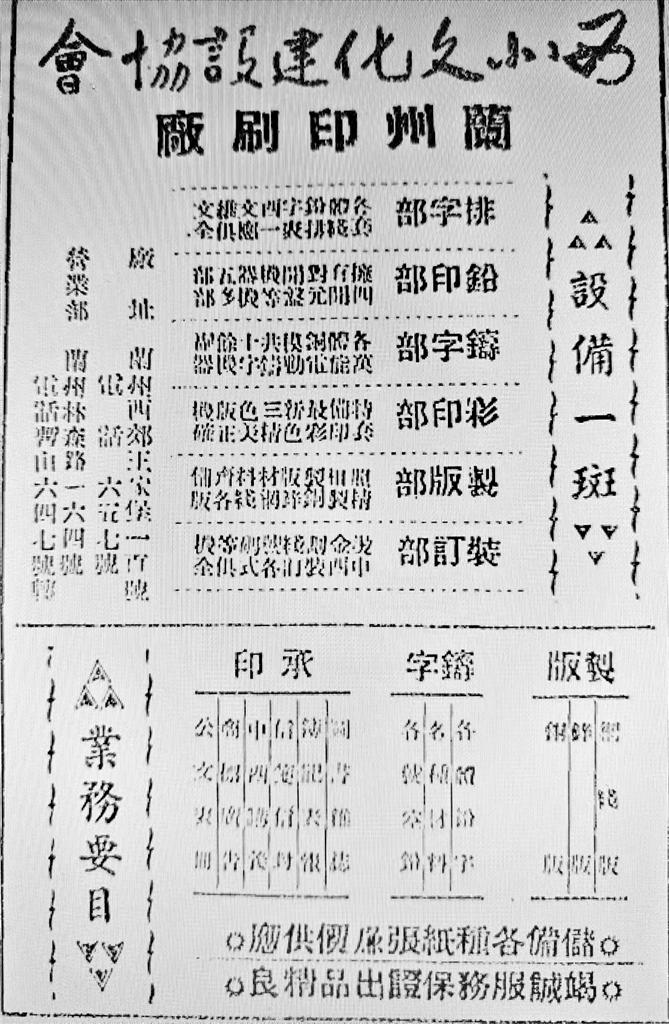 個(gè)別有實(shí)力的印刷廠也通過廣告拓展業(yè)務(wù)。如創(chuàng)辦于1947年9月的西北文化建設(shè)協(xié)會(huì)蘭州印刷廠是當(dāng)時(shí)甘肅規(guī)模較大的印刷廠之一,曾印制過《蘭州古今注》《花兒集》《西北論叢》《新光》等書刊。據(jù)當(dāng)年廣告所載,該廠內(nèi)設(shè)排字部、鉛印部、鑄字部、彩印部、制版部、裝訂部,承印范圍亦頗廣,包括圖書雜志、傳記表報(bào)、信箋信封、中西講義、商標(biāo)廣告、公文表格等。