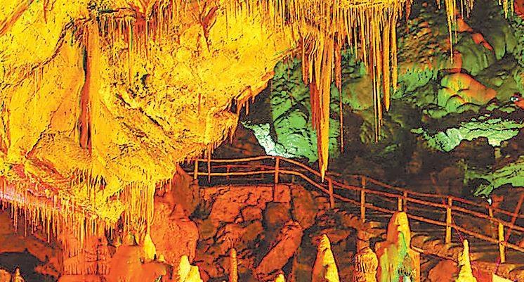 邊走邊看,巨大的石筍、石柱巍然聳立,站在“大廳”中央天然形成的小石橋往下看,橋下一片天然池水。走近邊池,走上小石橋,站在橋上看風(fēng)景。依托這些形態(tài)各異的鐘乳石,在不同明暗色彩的燈光照射下,給這些原本就讓人目瞪口呆的景致更加增添了夢(mèng)幻色彩。