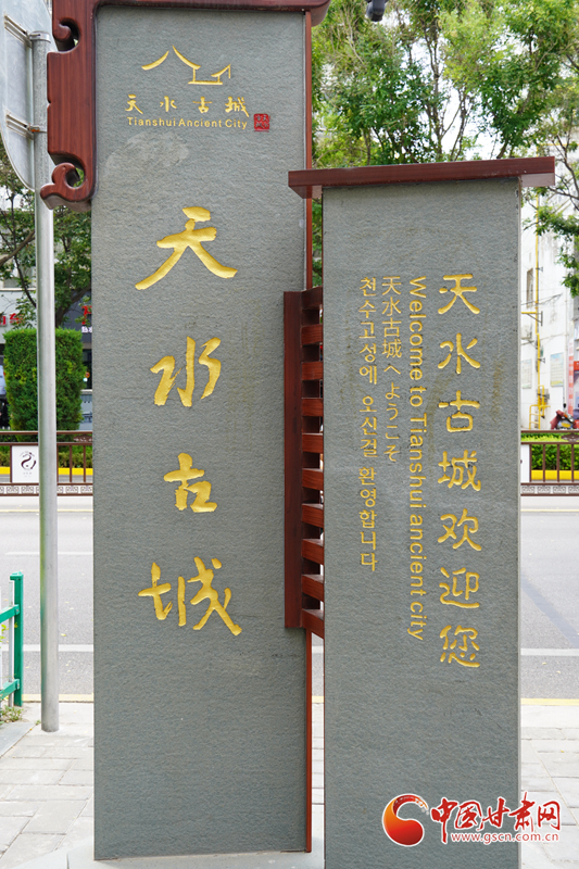 天水古城的路牌,上面用古建筑輪廓勾勒出天水古城的標(biāo)志。