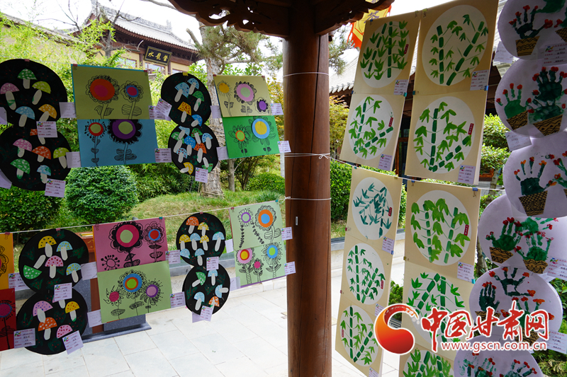 天水古城里的長(zhǎng)廊上展示著孩子們的繪畫(huà)、手工作品,將兩側(cè)長(zhǎng)廊掛滿,不少人駐足觀賞。