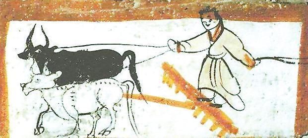二牛抬杠圖 出自嘉峪關魏晉墓磚畫