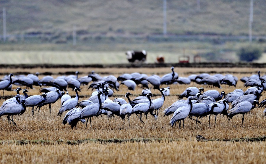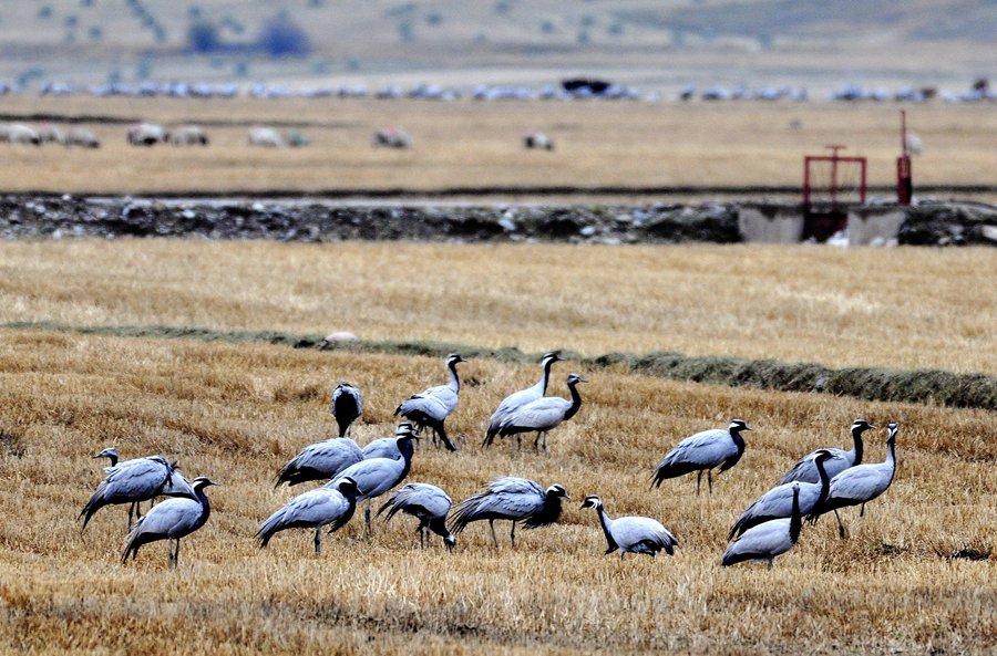 人民網(wǎng)蘭州10月10日電 (記者高翔)寒露至、候鳥(niǎo)遷,甘肅省肅南裕固族自治縣皇城鎮(zhèn)夏日塔拉草原迎來(lái)數(shù)千只蓑羽鶴,它們?cè)跐竦氐乃嫔?、草叢中或悠閑覓食、或蹁躚起舞,與色彩斑斕的草原構(gòu)成了一幅和諧優(yōu)美的生態(tài)畫(huà)卷。