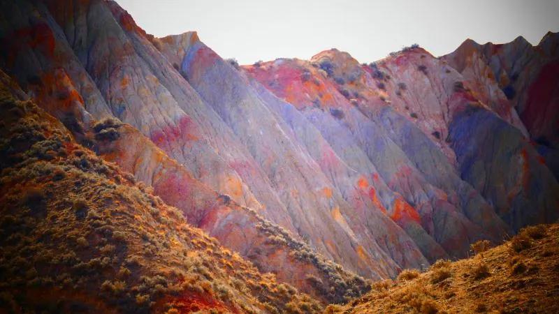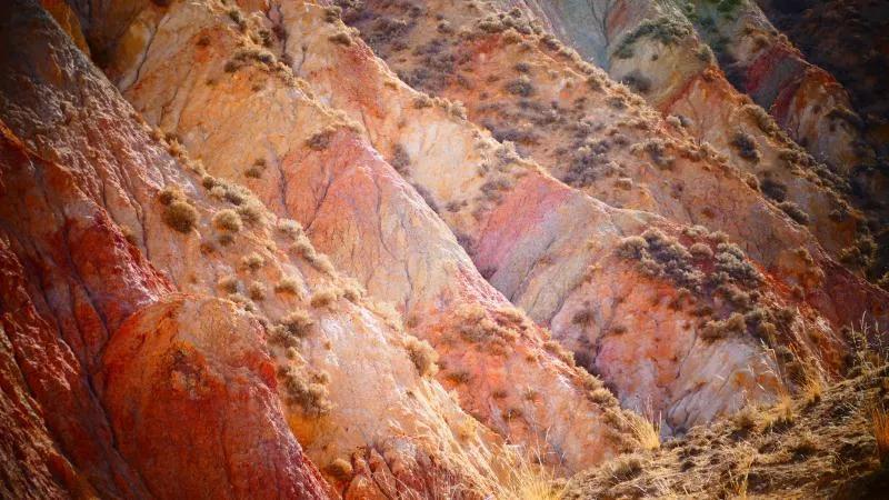 從馬營河大峽谷南端再向南一眼望去就是祁連雪山,沿著河道通過高臺縣新壩鎮(zhèn)的紅沙河村,向東南走進祁連山脈可見一片五顏六色的奇觀,又一個丹霞地貌在祁連山展現(xiàn),可稱高臺“小泉丹霞〞。據(jù)說這個“丹霞”還沒有媒體“曝過光〞。