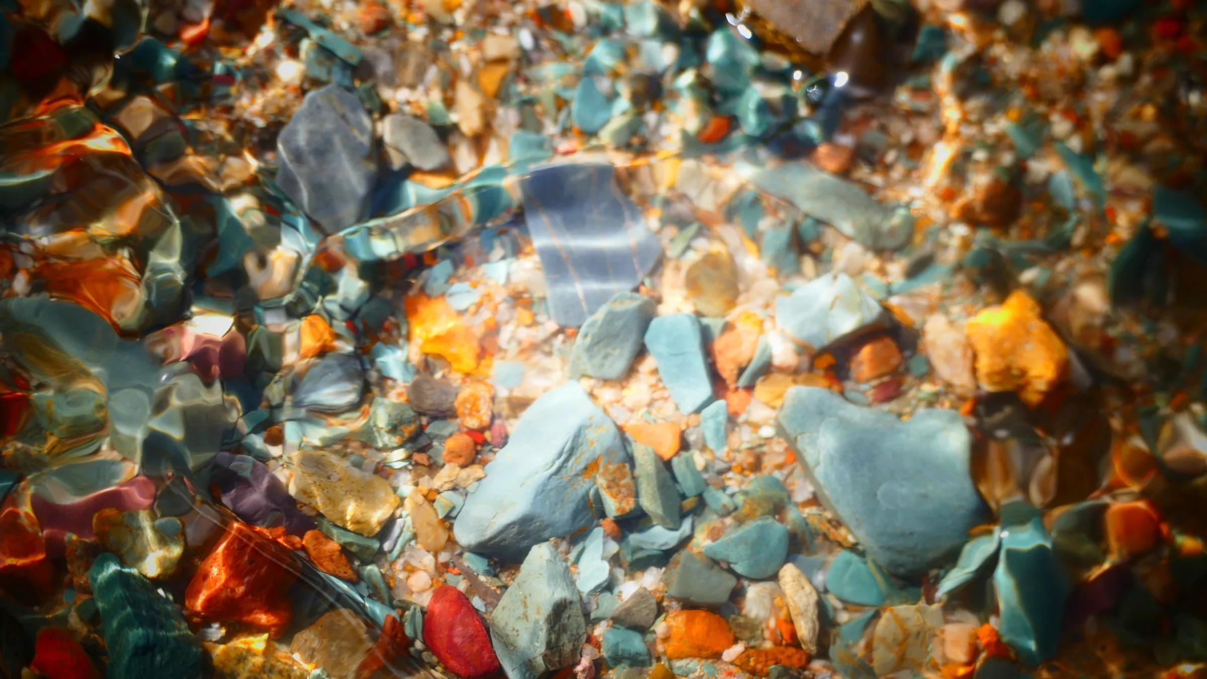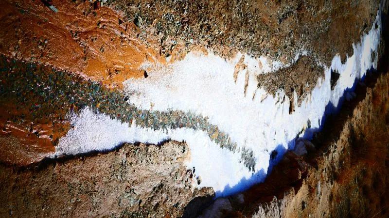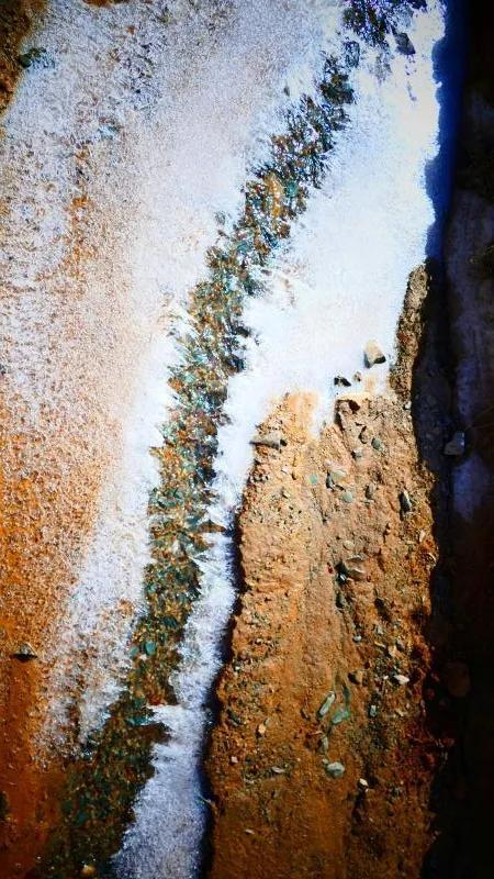 在丹霞山間可見一條冰凍似凍的水溪,系小泉河支流,在陽光下透過像東北冬天窗花一樣的冰花,可看見水下的鵝卵彩石,望遠看去小溪像一條披上雪衣的彩龍。