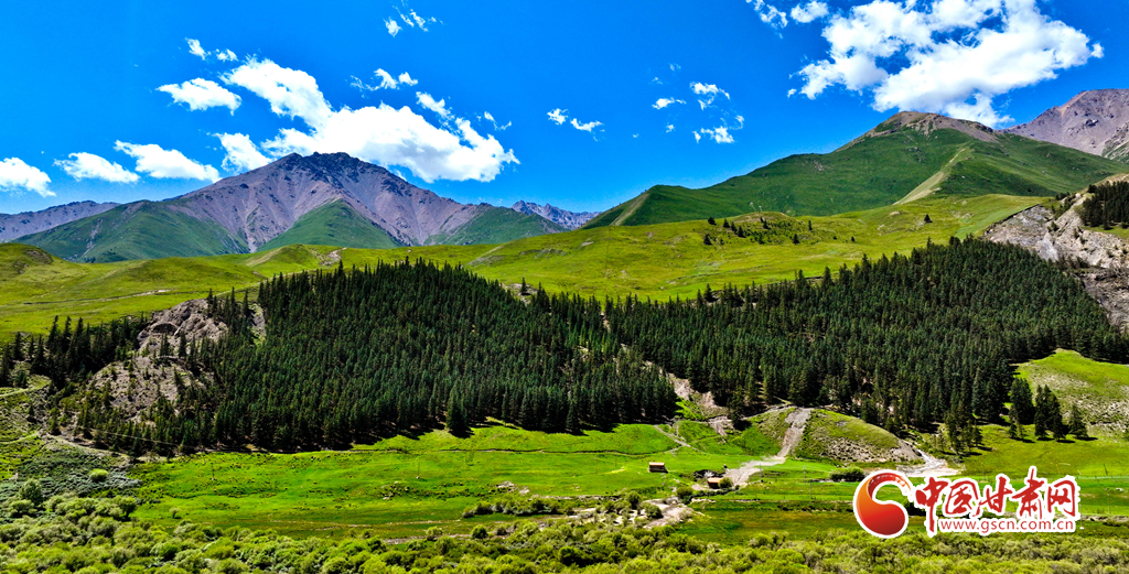 7月22日,祁連山國家公園甘肅省張掖市肅南裕固族自治縣大河鄉(xiāng)段,藍天白云下,巍峨壯麗的祁連山蒼松翠柏矗立其間,綠草如茵、水光粼粼,如同一幅壯美與秀麗并存的山水畫卷。