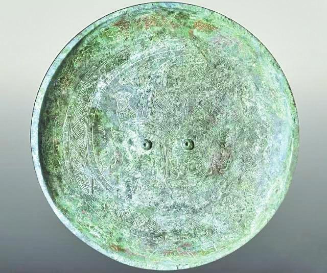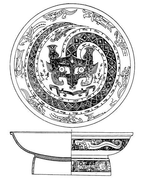 河南婦好墓出土婦好盤,口徑約36厘米,重5.9千克。腹外壁飾連續(xù)帶狀夔紋,足外壁飾連續(xù)帶狀饕餮紋,盤內壁以蟠龍為主紋,龍頭位于盤心,頭下配一夔紋,頭兩側分別鑄“婦好”銘文,蟠龍外圍飾一圈獸形紋,裝飾非常華麗。