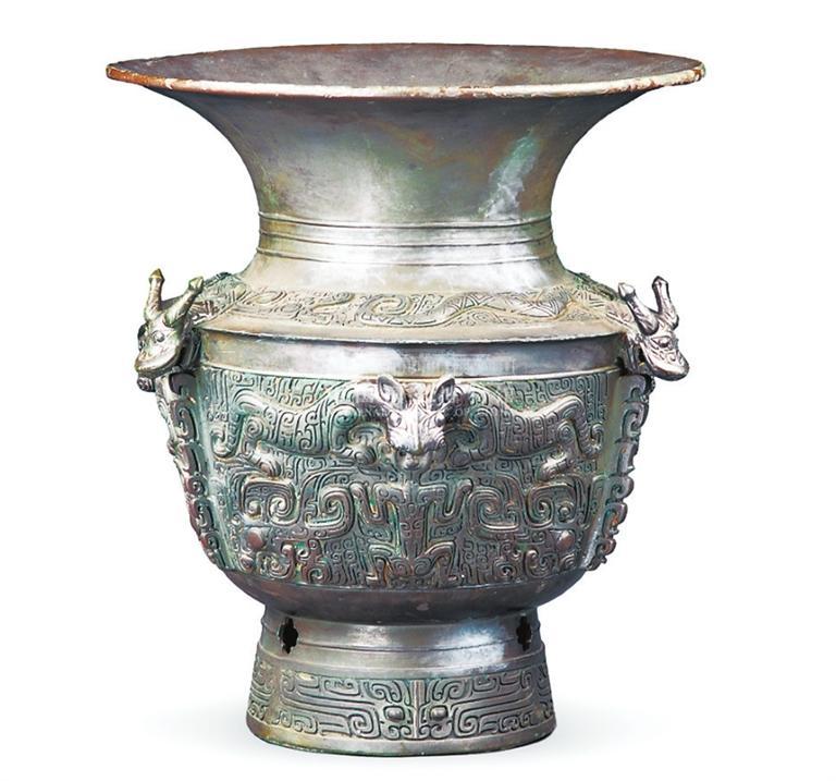 中國國家博物館收藏的龍虎紋青銅尊,高50.5厘米,重26.2千克,為一件體形較高大的盛酒器。青銅尊肩部以圓雕和浮雕相結合,塑造3條生動的蟠龍形象,龍身蜿蜒,龍首探出,額有雙角,闊吻巨口,兩眼大睜。腹部紋飾為一個虎頭兩個虎身,虎口之下有一人形,人頭銜于虎口之中?;⑸硐路揭造槔鉃榻纾梼少琮埾鄬M成的獸面。從主體花紋看,龍、虎、人造型莊嚴穩(wěn)重、奇特神秘,特別是龍頭和虎頭用澆鑄法從外壁突兀凸起,雄健粗獷,比起用高浮雕法更具有一種威武逼人的悍氣。龍虎尊圓形大口表示上天,肩部神龍游蕩于空中;猛虎張牙舞爪守護大地。龍虎尊的鑄造采用十八塊母范經(jīng)兩次焊接而成,渾然一體,毫無痕跡。整器工藝精湛,花紋線條洗練,是商代青銅器中的精品。