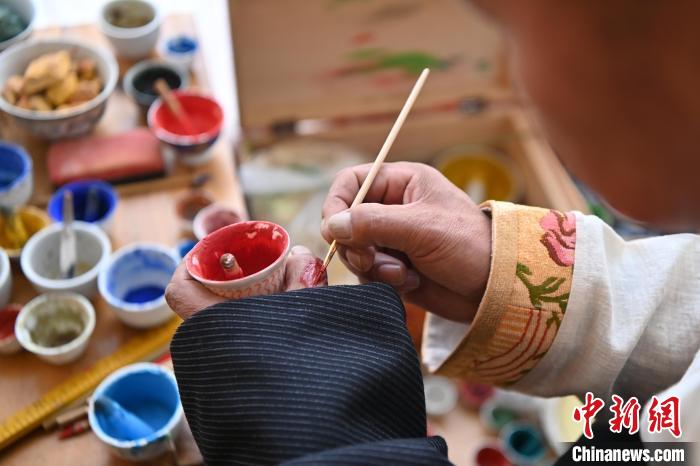 圖為交巴加布在個人工作室內(nèi)給唐卡上色。一幅精美的唐卡作品,需要耗費(fèi)畫師幾個月甚至幾年時間。從勾線到著色,每一步、每一筆都要屏息凝神。九美旦增 攝