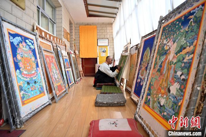 交巴加布的唐卡作品涵蓋了布面彩繪唐卡、珍珠唐卡、刺繪唐卡、織錦唐卡等10余種類型。他在唐卡著色、暈染、勾線、上色等方面都有很深的造詣,使得他的作品色彩鮮艷、線條流暢、構(gòu)圖巧妙,充滿了藝術(shù)魅力。圖為交巴加布在個人工作室展示繪制的小唐卡。九美旦增 攝