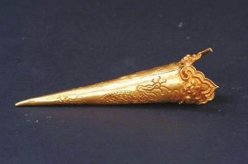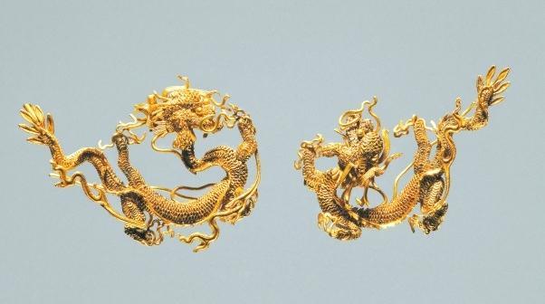所有龍紋,都是先把黃金掐出細細的金絲做出輪廓,然后用顆粒較大的金珠沿中脊金線焊接形成連珠式“龍脊”,再用顆粒較小的“金粟”填充龍身。龍紋之間裝飾流線狀的云氣紋。