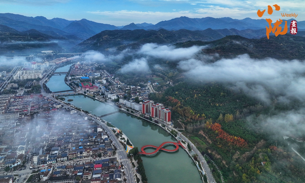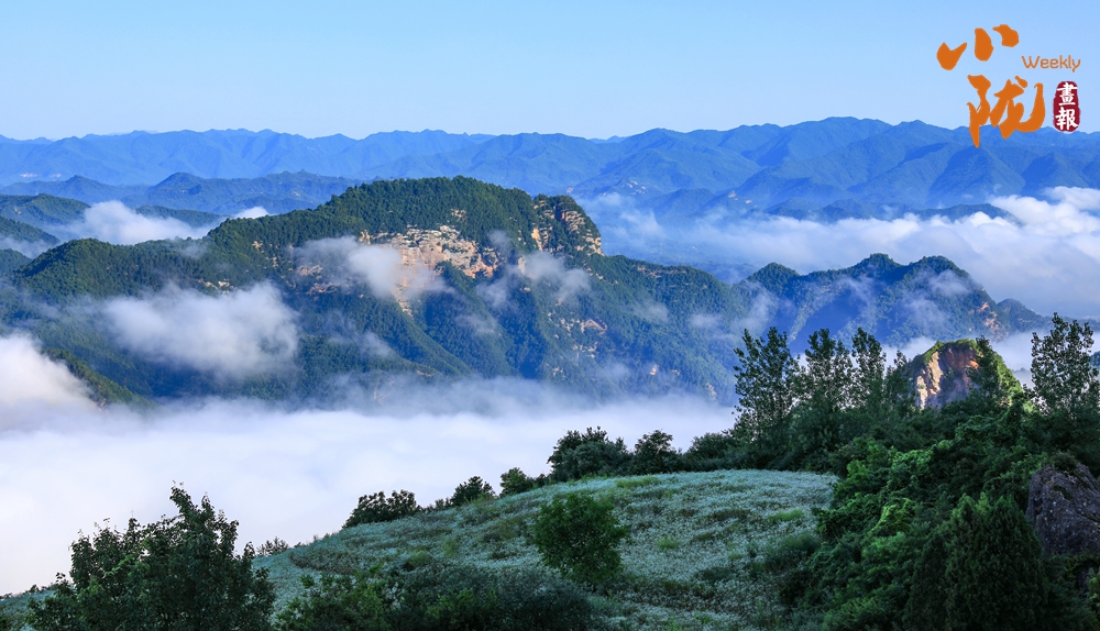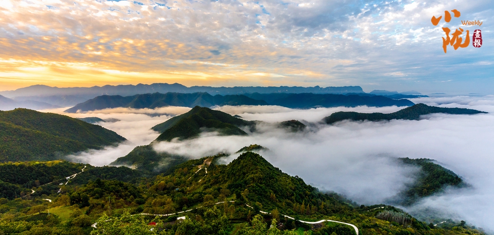連綿起伏的山巒被綠色包裹,群峰之間薄霧繚繞,天光云影,如畫仙境。
