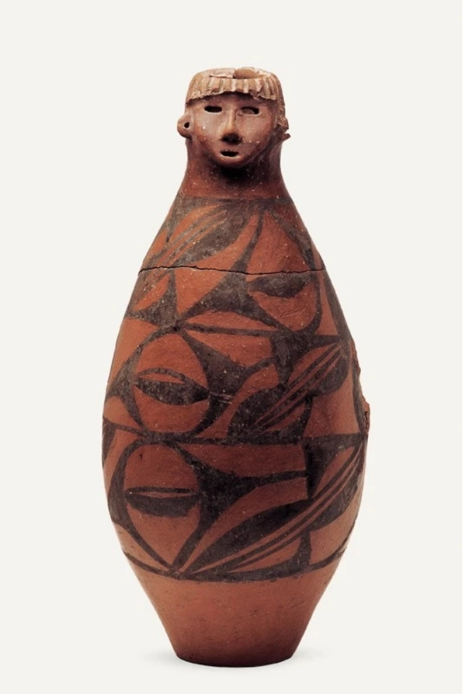 隴東少女作為甘肅的“顯眼包”之一,是曾在《國(guó)家寶藏》中出現(xiàn)過(guò)的“網(wǎng)紅”、甘肅省博物館鎮(zhèn)館之寶,它于1973年從秦安縣大地灣遺址出土。具有高度審美能力的“托尼”老師,設(shè)計(jì)了齊劉海發(fā)型,顯得很泰酷辣,圓鼓腹、平底,人們細(xì)看發(fā)現(xiàn),陶人的兩眼為圓孔洞,顯得目光深邃;鼻子呈蒜頭形,雕有鼻孔;嘴較小,微微張開(kāi),好像正在言語(yǔ);兩耳外展,皆有穿孔;瓶體從上至下以黑彩飾三層大小相同、由弧線三角紋和斜線組成的二方連續(xù)圖案,以示華麗的衣物。另外,陶瓶人頭像的器口運(yùn)用了不同的制作手法,頭發(fā)、嘴系雕刻而成,鼻、臉是捏塑而成。人頭像五官整齊、面龐秀麗,器身造型典雅,與人物形象渾然一體,既是大地灣文化彩陶的代表作,也是中國(guó)史前集彩繪、雕塑與造型藝術(shù)于一身的杰作。估計(jì)任誰(shuí)看一眼,都會(huì)被“她”的神秘和美麗所吸引吧。