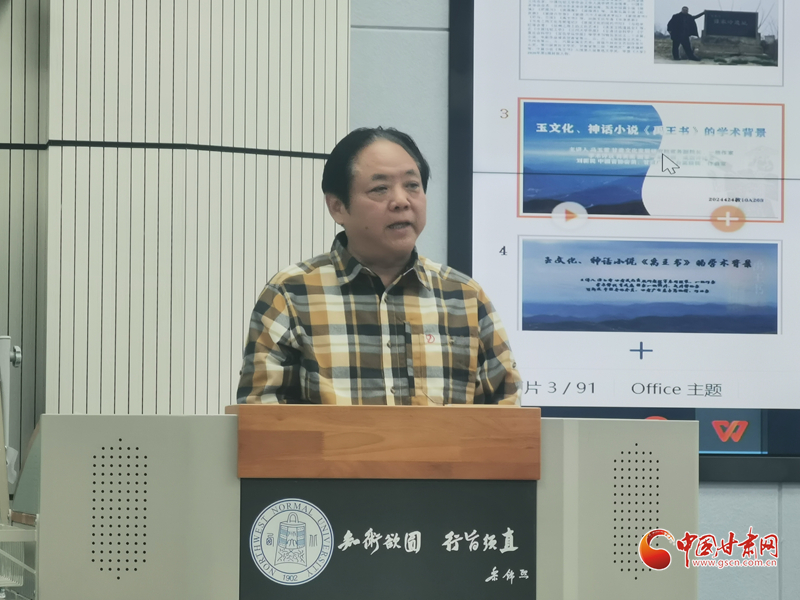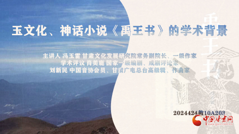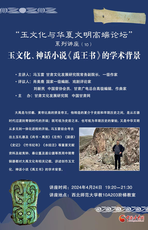 4月24日晚,馮玉雷講座“玉文化、神話小說(shuō)《禹王書》的學(xué)術(shù)背景”在西北師范大學(xué)舉辦。這次講座是甘肅文化發(fā)展研究院和中國(guó)甘肅網(wǎng)聯(lián)合舉辦的“玉文化玉華夏文明高端論壇”系列講座第十講,也是近期啟動(dòng)的“巡禮馬銜山:玉文化與文學(xué)融合發(fā)展”系列活動(dòng)之一,甘肅文化發(fā)展研究院常務(wù)副院長(zhǎng)、一級(jí)作家馮玉雷主講,國(guó)家一級(jí)編劇、戲劇評(píng)論家肖美鹿,中國(guó)音協(xié)會(huì)員、甘肅廣電總臺(tái)高級(jí)編輯、作曲家劉新民擔(dān)綱學(xué)術(shù)評(píng)議嘉賓。
