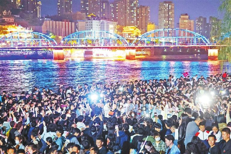 作為蘭州的地標(biāo)之一,中山橋已經(jīng)是來(lái)蘭游客必“打卡”的景點(diǎn)?;馃?ldquo;出圈”的“黃河大合唱”成為蘭州旅游新體驗(yàn)。華燈初上,游客和市民齊聚黃河岸邊,隨著音樂(lè)齊聲合唱,場(chǎng)面壯觀,氣氛熱烈。“五一”假期首日,蘭州文旅市場(chǎng)迎來(lái)火爆“開門紅”,接待游客達(dá)到了86.42萬(wàn)人次。