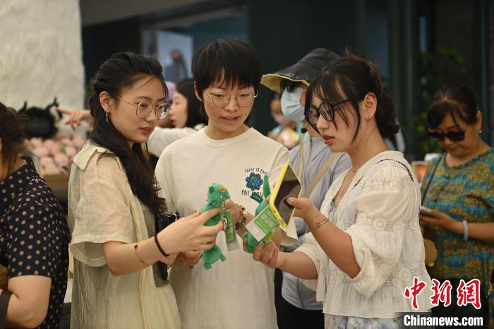 6月19日,甘肅省博物館藝術(shù)生活館在甘肅蘭州開館。該館是甘肅省博物館打造的一處復(fù)合型高價(jià)值文化空間,融合了咖啡、烘焙、展覽、藝術(shù)書店、文創(chuàng)銷售等多樣化業(yè)態(tài)。圖為游客挑選蘭州凍梨文創(chuàng)玩偶。中新社記者 李亞龍 攝