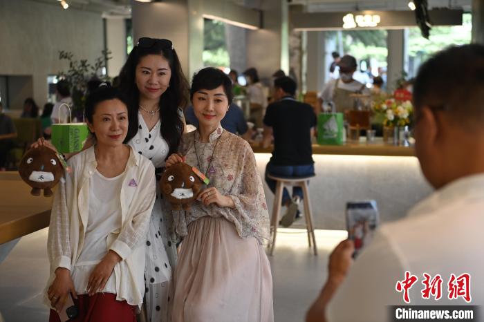 6月19日,甘肅省博物館藝術(shù)生活館在甘肅蘭州開館。該館是甘肅省博物館打造的一處復(fù)合型高價(jià)值文化空間,融合了咖啡、烘焙、展覽、藝術(shù)書店、文創(chuàng)銷售等多樣化業(yè)態(tài)。圖為顧客與自己挑選的蘭州凍梨文創(chuàng)玩偶合影。中新社記者 李亞龍 攝