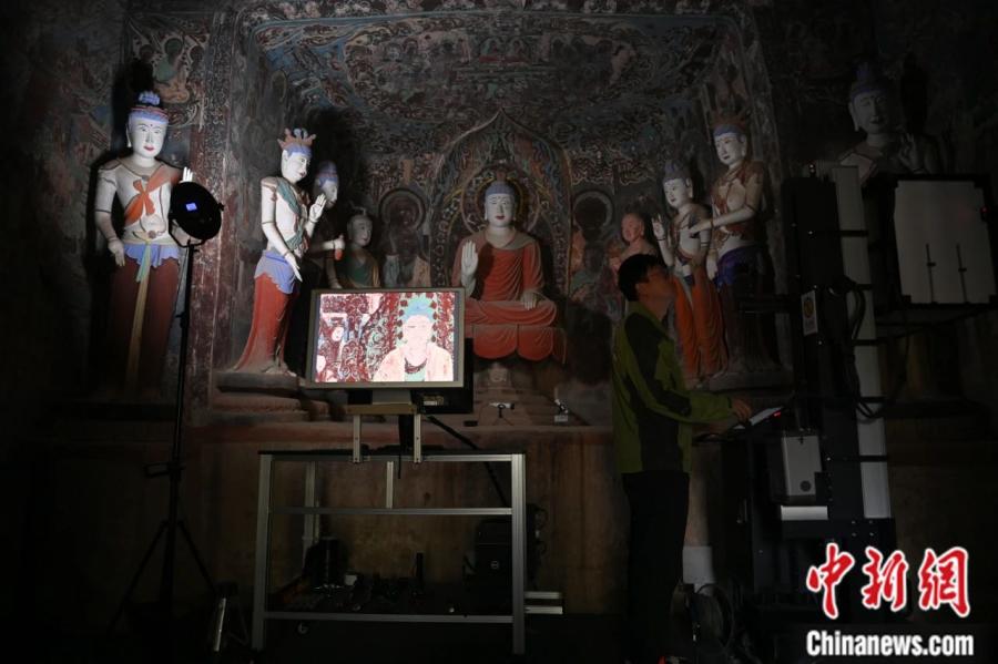 2024年6月,甘肅敦煌莫高窟內,敦煌研究院文物數字化研究所工作人員進行敦煌壁畫數字化采集工作。李亞龍 攝