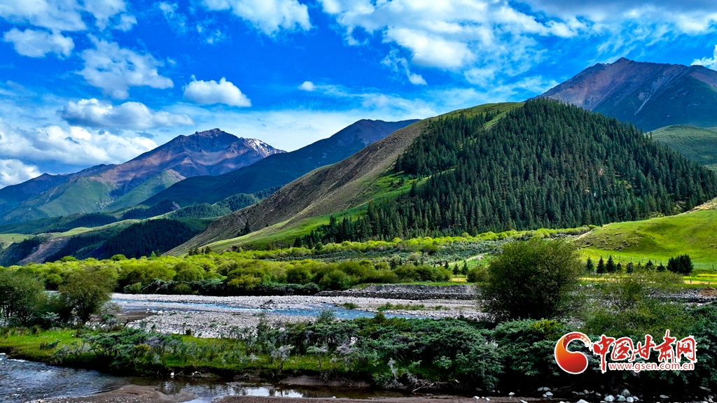 7月2日,祁連山國(guó)家公園甘肅省張掖市肅南裕固族自治縣大河鄉(xiāng)段,在高原藍(lán)天白云映襯下,群山環(huán)抱、 雪峰高聳,鳥(niǎo)鳴聲陣陣的濕地、奔騰不歇的黑河水、猶如“巨幅綠毯”的草原,勾勒出一幅風(fēng)光壯美的生態(tài)畫卷。