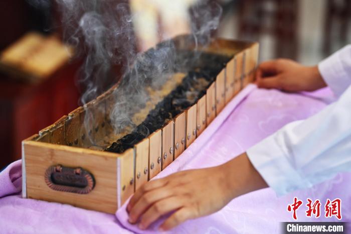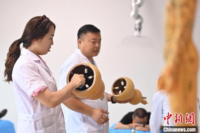 7月16日,甘肅省平?jīng)鍪徐`臺(tái)縣皇甫謐針灸康養(yǎng)館內(nèi),工作人員對(duì)患者進(jìn)行葫蘆灸治療。2006年,靈臺(tái)皇甫謐針灸術(shù)入選第一批甘肅省非物質(zhì)文化遺產(chǎn)名錄。靈臺(tái)作為皇甫謐故里,當(dāng)?shù)孛癖姺浅UJ(rèn)可中醫(yī)康養(yǎng),針灸、拔火罐、推拿、葫蘆灸、火龍灸(督脈灸)等中醫(yī)特色療法受到了很多人的青睞,當(dāng)?shù)毓俜揭餐ㄟ^(guò)舉辦大型節(jié)會(huì)等助推中醫(yī)康養(yǎng)產(chǎn)業(yè)發(fā)展。 皇甫謐是針灸醫(yī)學(xué)鼻祖,其《針灸甲乙經(jīng)》已在多個(gè)國(guó)家被廣泛傳播應(yīng)用。中新社記者 李亞龍 攝