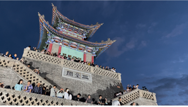 夕陽(yáng)西下,夜色漸濃,三臺(tái)閣上游人如織,山下的萬(wàn)家燈火隨著夕陽(yáng)余暉的隱退漸漸蘇醒,一盞盞燈光次第亮起,璀璨如星海。人們紛紛舉起手機(jī)和相機(jī),記錄下這一刻的美好。“真不愧是金城蘭州,站在這里俯瞰蘭州是什么神仙視角!”“終于知道夜晚的蘭州為啥被稱作‘蘭哈頓’了,回去好好跟朋友炫炫……”來(lái)自陜西的大學(xué)生小劉和他的小伙伴們一邊尋找拍照最佳角度,忍不住發(fā)出贊嘆。在這一刻,古老的閣樓與游客一起沉醉在蘭山的夏夜晚風(fēng)中?!?/p>
