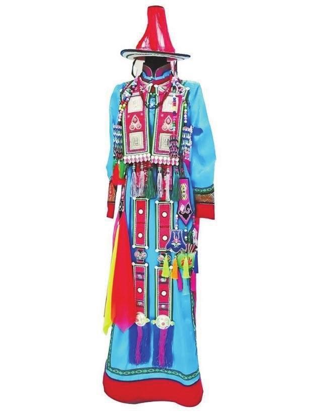 女性婚服是最隆重的,很多婚后日常服裝也在此時備好。女性婚服中最具辨識度的是頭面,長條形頭面佩戴在女子的三條長辮子上,胸前兩條,背后一條。多見布制的頭面,綴上珊瑚、綠松石、瑪瑙等,也有用紅牛皮底、黑或紅色絲絨底的頭面,鑲上銀牌、蜜蠟、珊瑚、松石等飾物,背后的一條頭面下方垂一顆紅珊瑚,上面鑲23塊白色海螺磨制的圓片,這種傳統(tǒng)頭面總重量約在五到七斤左右。傳統(tǒng)女性婚服多用藍(lán)色和綠色,以區(qū)別于著紅色服裝的“點(diǎn)格爾汗”天神。隨著文化的交流變化,對服裝色彩的禁忌逐漸消解,黃色、米黃色、紅色等色彩也常被新娘穿戴。