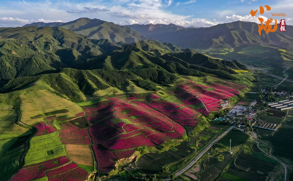 盛夏,這里高聳云天,滿(mǎn)山翠綠,藍(lán)天白云下,如波浪般的山坡上,金色點(diǎn)綴山谷,鮮黃映襯碧綠,玫紅耀眼奪目,將祁連山腳妝點(diǎn)的五彩斑斕。