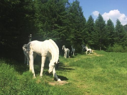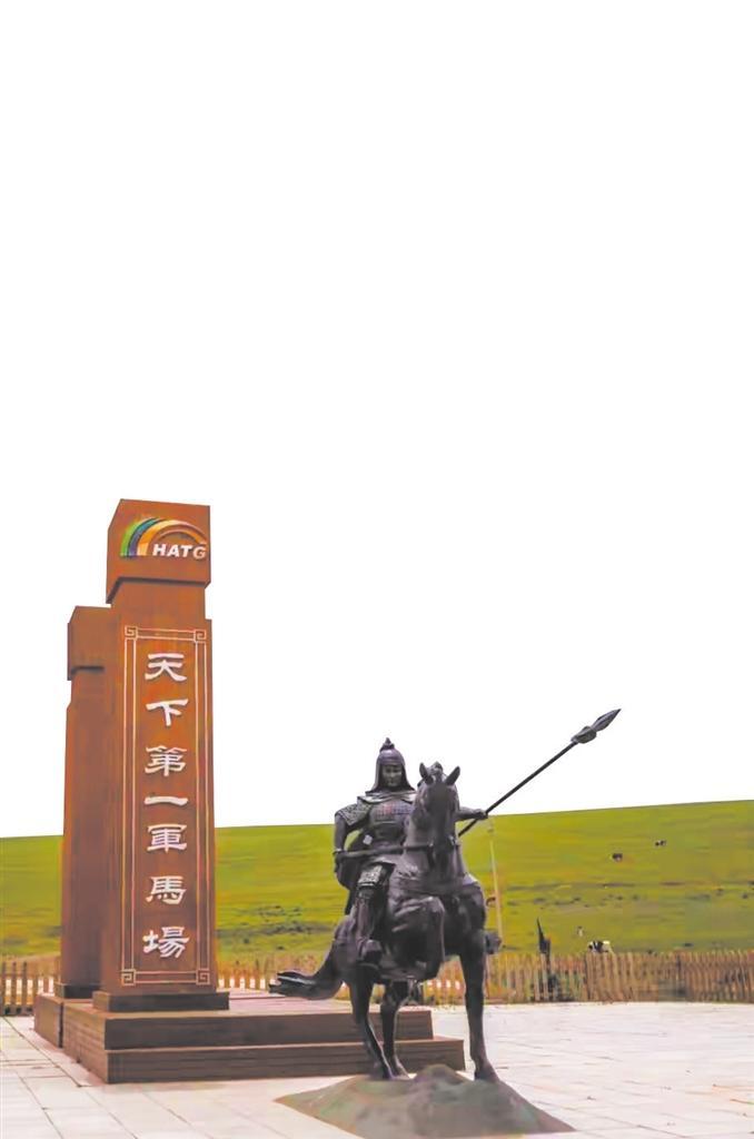 在碧草連天的谷地,當?shù)芈糜尾块T擺放了一組白馬的大型雕塑,栩栩如生,它們要么仰天長嘶,要么低首撫弄地上的青草,還有的彼此耳鬢廝磨,像是親密的戀人。
