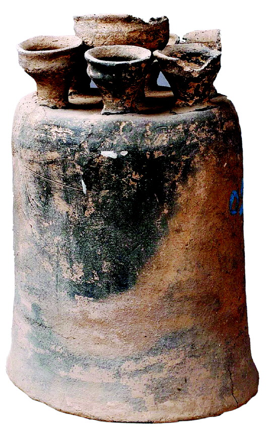 寺洼文化灰陶聯(lián)盞,通身為泥質(zhì)灰陶,主體呈一倒扣的鐘形,在鐘形體的頂端粘連著七個(gè)豆?fàn)畋K杯。其中中間一個(gè)稍大略高,其他六個(gè)稍小一些,等距分布在中央一個(gè)的周?chē)?,呈眾星拱月之狀?/p>