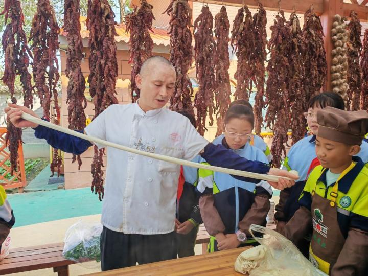 話音剛落,同學們戴上廚師帽,系好圍裙,紛紛擼起袖子嘗試制作蘭州牛肉面,他們學著老師的模樣搓制面團、拉面條,切蒜苗……從中學習制作這一傳統(tǒng)美食的技藝。