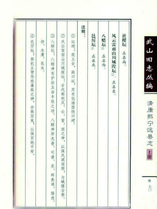 《清康熙寧遠(yuǎn)縣志》也有記載:“風(fēng)云雷雨山川城隍壇,在縣東。古代祭祀風(fēng)、云、雷、雨之神,以保風(fēng)調(diào)雨順,與城隍合祭。”“風(fēng)云雷雨壇”:“在城東郊外,祭用春秋二仲上巳日,設(shè)三壇,風(fēng)云雷雨居中,山川居左,城隍居右,陳設(shè)與社稷同,城隍廟與風(fēng)云雷雨壇合祭。”