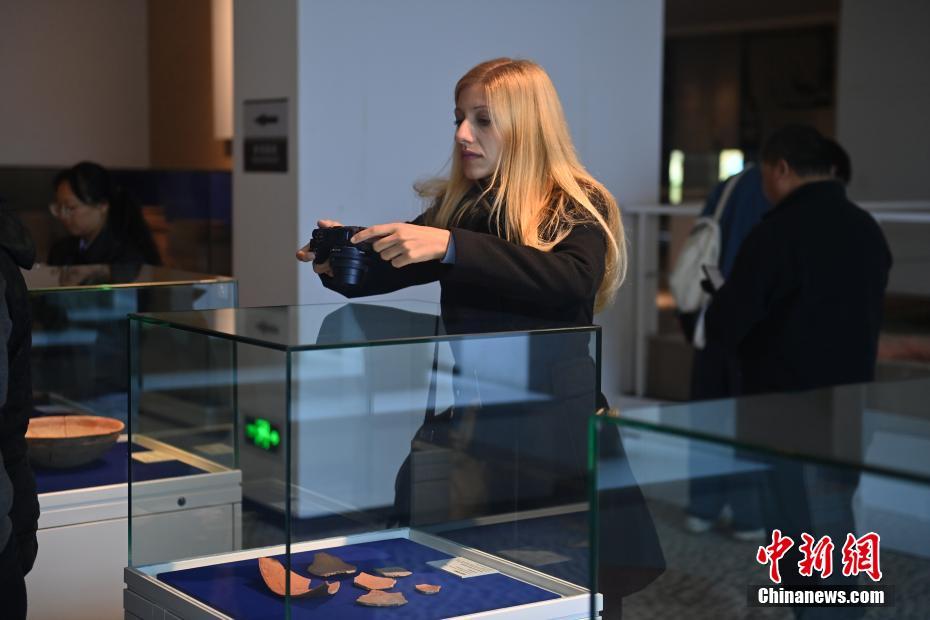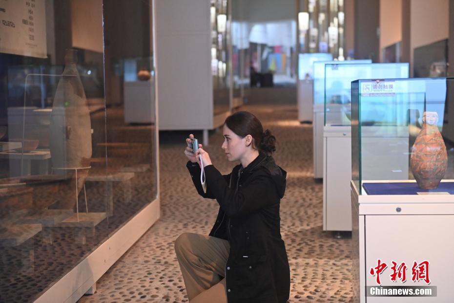 10月22日,2024青年漢學家研修計劃甘肅班團隊22個國家的青年漢學家,走進甘肅省天水市秦安縣大地灣遺址參觀并進行專題研修。大地灣遺址是新石器時代大型聚落遺址,出土了中國乃至世界上最早的彩陶文化、最早的文字符號、種植生產(chǎn)了中國第一批糧食品種黍、出現(xiàn)了最早的宮殿式建筑、發(fā)明了世界最早的水泥地面、創(chuàng)造了最早的繪畫作品——F411地畫。圖為國外青年漢學家拍攝大地灣博物館藏品。中新社記者 李亞龍 攝
