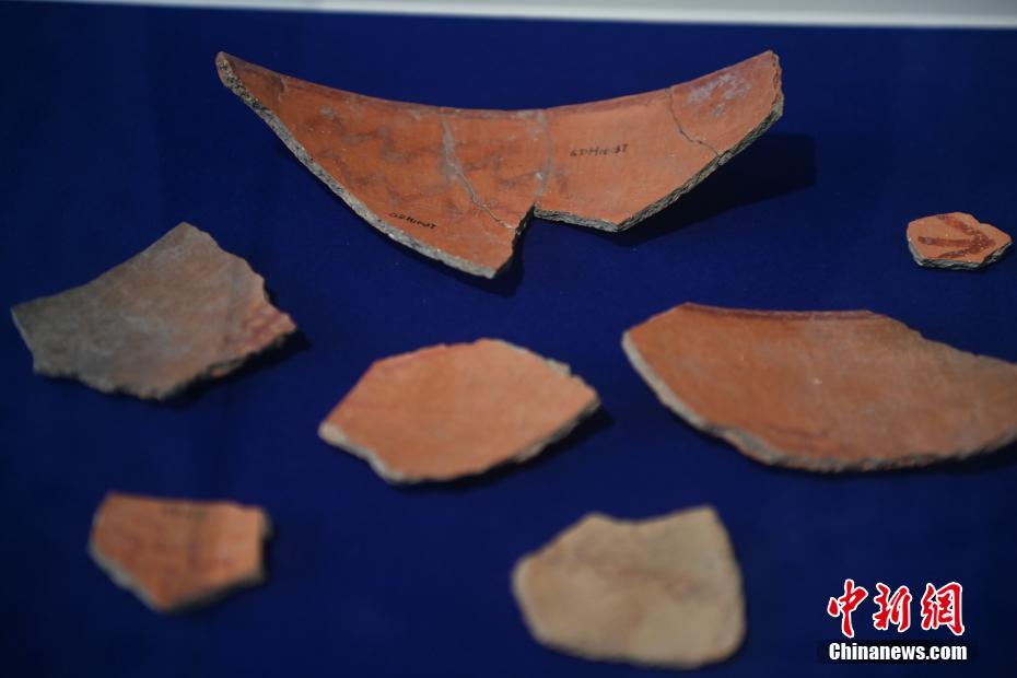 ?。保霸拢玻踩?,2024青年漢學家研修計劃甘肅班團隊22個國家的青年漢學家,走進甘肅省天水市秦安縣大地灣遺址參觀并進行專題研修。大地灣遺址是新石器時代大型聚落遺址,出土了中國乃至世界上最早的彩陶文化、最早的文字符號、種植生產(chǎn)了中國第一批糧食品種黍、出現(xiàn)了最早的宮殿式建筑、發(fā)明了世界最早的水泥地面、創(chuàng)造了最早的繪畫作品——F411地畫。圖為大地灣博物館展品最早的文字符號彩繪符號陶片。中新社記者 李亞龍 攝