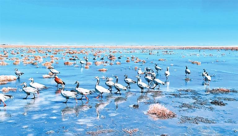 從瑪曲黃河大橋一路往西,沐浴著高原冬日的暖陽,看著遠(yuǎn)天悠悠低垂的白云,呼吸著清新濕潤的空氣,黃河在身邊靜靜地流動,沿河兩岸的瑪曲草原上,雪山與湖泊交錯,遠(yuǎn)處的瑪曲縣城依稀可見。被黃河滋養(yǎng)的瑪曲草原遼闊溫婉,在湛藍(lán)的天空下,成群的牛羊自由奔跑,鑲嵌在草原的湖泊清澈透亮,吸引著白天鵝、黃鴨等野生鳥類棲息在這片“世外桃源”。