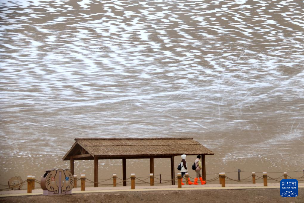 11月23日,游客在敦煌市鳴沙山月牙泉景區(qū)欣賞雪景。新華社發(fā)(張曉亮 攝)