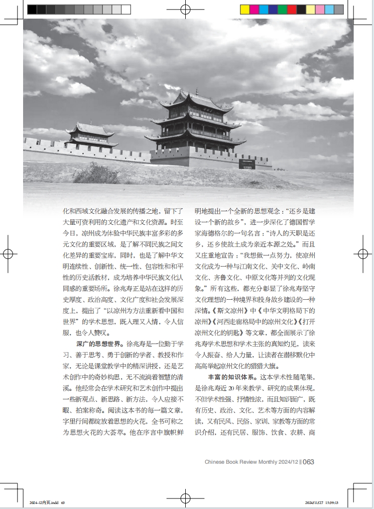 開闊的學(xué)術(shù)視野。全書是圍繞“涼州”這一地名而夾敘夾議的,但徐兆壽并沒有就“涼州”談“涼州”,而是把“涼州”放在中華文明演變發(fā)展的大格局下來思考和書寫的。他認(rèn)為,歷史上的涼州,是一個變動不居的概念,涼州初立時在漢代,比今天的甘肅還要大,此后慢慢變小,到唐代時縮小為今天的武威。人們今天所說的涼州就是位于河西走廊東端的武威市。兩千多年前,張騫的“鑿空之旅”,開辟了古絲綢之路,打開了各國友好交往的新窗口,開啟了人類文明史上的大交流時代。此時,涼州成為古絲綢之路的要沖和河西走廊的中心城市,是溝通中國中原地區(qū)與西域的交通要道,是中原文化和西域文化融合發(fā)展的傳播之地,留下了大量可資利用的文化遺產(chǎn)和文化資源。時至今日,涼州成為體驗中華民族豐富多彩的多元文化的重要區(qū)域,是了解不同民族之間文化差異的重要寶庫,同時,也是了解中華文明連續(xù)性、創(chuàng)新性、統(tǒng)一性、包容性和和平性的歷史活教材,成為培養(yǎng)中華民族文化認(rèn)同感的重要場所。徐兆壽正是站在這樣的歷史厚度、政治高度、文化廣度和社會發(fā)展深度上,提出了“以涼州為方法重新看中國和世界”的學(xué)術(shù)思想,既入理又入情,令人信服,也令人贊嘆。