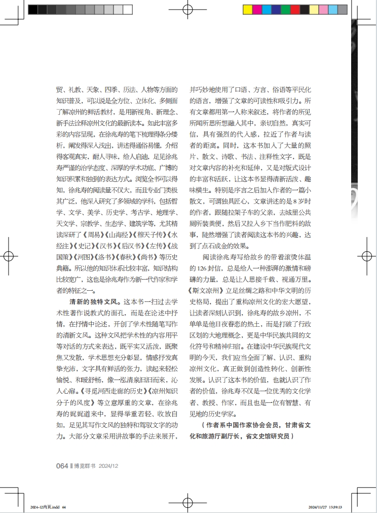 豐富的知識體系。這本學(xué)術(shù)性隨筆集,是徐兆壽近20年來教學(xué)、研究的成果體現(xiàn),不但學(xué)術(shù)性強、抒情性濃,而且知識面廣,既有歷史、政治、文化、藝術(shù)等方面的內(nèi)容解讀,又有民風(fēng)、民俗、家訓(xùn)、家教等方面的常識介紹,還有民居、服飾、飲食、農(nóng)耕、商貿(mào)、禮教、天象、四季、歷法、人物等方面的知識普及,可以說是全方位、立體化、多側(cè)面了解涼州的鮮活教材,是用新視角、新理念、新手法詮釋涼州文化的最新讀本。如此豐富多彩的內(nèi)容呈現(xiàn),在徐兆壽的筆下梳理得條分縷析,闡發(fā)得深入淺出,講述得通俗易懂,介紹得客觀真實,耐人尋味,給人啟迪,足見徐兆壽嚴(yán)謹(jǐn)?shù)闹螌W(xué)態(tài)度、深厚的學(xué)術(shù)功底、廣博的知識積累和獨到的表達方式。瀏覽全書可以得知,徐兆壽的閱讀量不僅大,而且專業(yè)門類極其廣泛,他深入研究了多領(lǐng)域的學(xué)科,包括哲學(xué)、文學(xué)、美學(xué)、歷史學(xué)、考古學(xué)、地理學(xué)、天文學(xué)、宗教學(xué)、生態(tài)學(xué)、建筑學(xué)等,尤其精讀深研了《周易》《山海經(jīng)》《穆天子傳》《水經(jīng)注》《史記》《漢書》《后漢書》《左傳》《戰(zhàn)國策》《河圖》《洛書》《春秋》《尚書》等歷史典籍。所以他的知識體系比較豐富,知識結(jié)構(gòu)比較寬廣,這也是徐兆壽作為新一代作家和學(xué)者的特征之一。