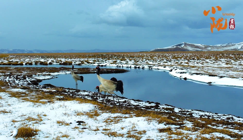 “高原精靈”黑頸鶴身披黑白相間的羽衣,舒展著身體,或低頭覓食,它們優(yōu)雅的身姿成為冬日里一道亮麗的風(fēng)景線。